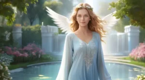 ― Um anjo, com asas. Bonita, no meio de um jardim lindo, cheios de fontes mais lindas ainda. Com roupas de anjo, uma túnica comprida, azul-claro. Ainda não decide minha aparência, talvez eu fique com essa mesma.