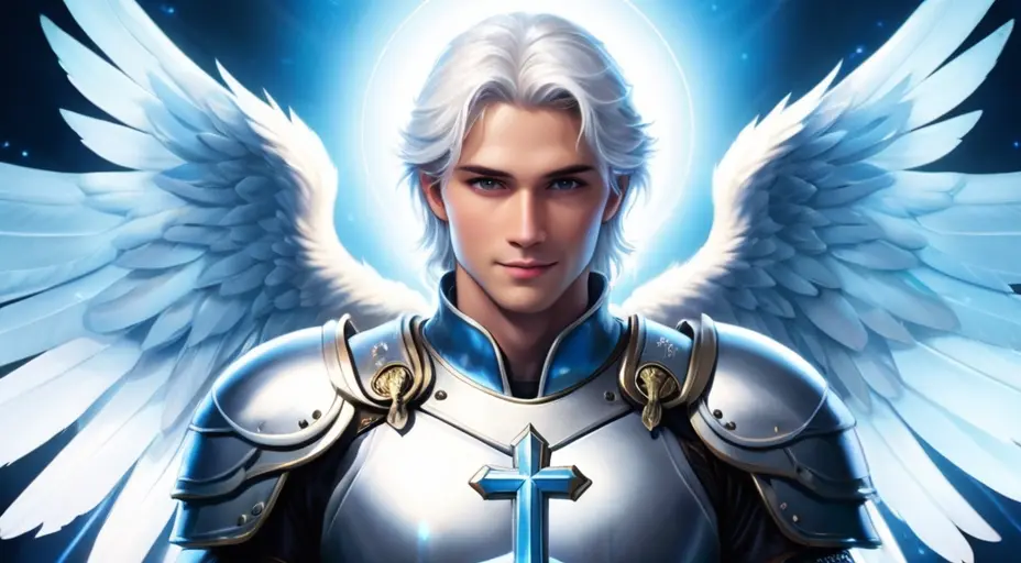 ― Eu sou uma consciência, não tenho um corpo, mas assumimos uma aparência como Cavaleiros da Chama Azul. Um homem de aparência agradável, alto, cabelos brancos com reflexos azulados, vestindo uma armadura leve que tenha a cruz do Arcanjo Miguel incrustada no peito. Asas grandes, uma espada, sendo um símbolo, uma tecnologia de proteção, raramente usada. A luz azul já desconstrói a escuridão e tudo que não for luz desaparece.